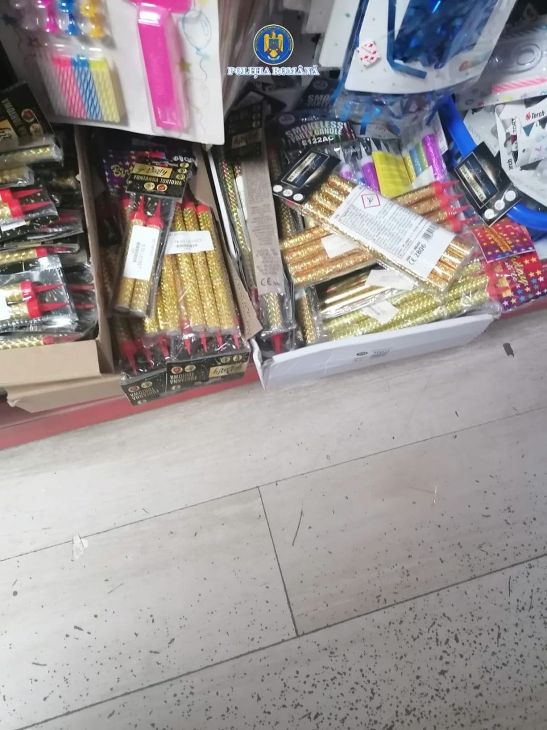 Pe parcursul acțiunii poliţiştii au constatat că au fost expuse spre vânzare, articole pirotehnice din categoria F1, neconforme și inscripționate în limbă străină, fără ca operatorul economic să fie autorizat de Inspectoratul Teritorial De Muncă Maramureș pentru a le deține și comercializa. 45 kg articole pirotehnice, în valoare de 14.700 lei, a fost ridicată în vederea continuării cercetărilor.