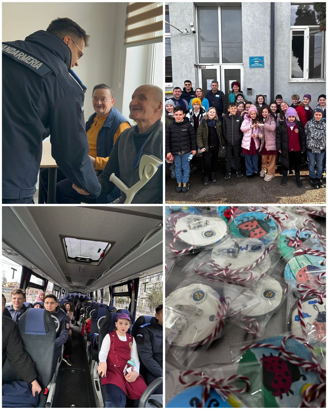 Așa că, dis de dimineață, jandarmii au adus autocarul, iar copiii buna dispoziție și au pornit împreună, cu entuziasm și determinare să îndeplinească o misiune de suflet, aceea de a fi aproape, cu un mărțișor și un dar, de sufletul celor care, prin experiențele acumulate, sunt exemple și repere pentru noile generații.