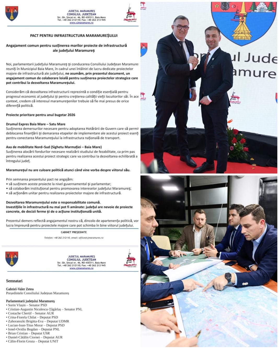 La Consiliul Județean Maramureș, în prezența parlamentarilor carr au pus deoparte haina politică, a foat semnat un pact comun pentru a susține proiectele majore de infrastructură din județul nostru. Este vorba despre Drumul Expres Baia Mare – Satu Mare – care va conecta Maramureșul la infrastructura națională de transport și Axa de mobilitate Nord–Sud (Sighetu Marmației – Baia Mare) – un proiect strategic pentru dezvoltarea întregului județ.